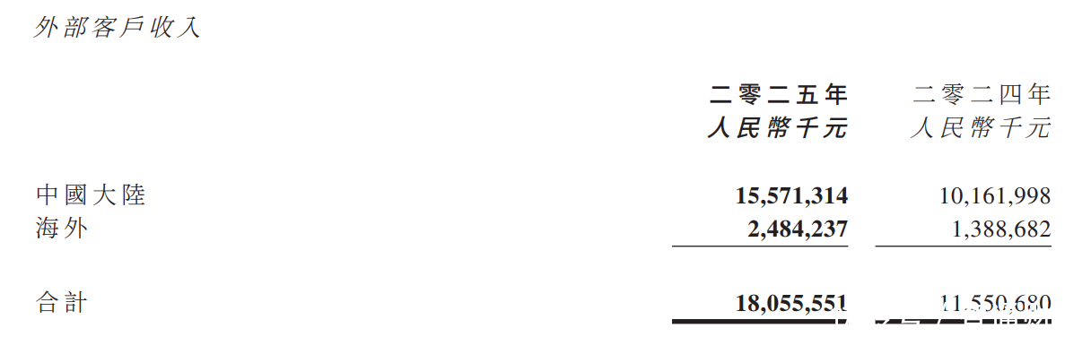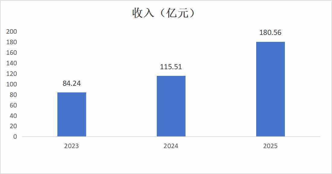 2025 年该公司国内市场及海外市场收入分别为 155.71 亿元及 24.84 亿元,同比分别增长 53.2% 及 78.83%,占比收入分别为 86.24% 及 13.76%。