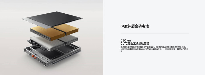 新车提供两种电池选项,61.47kWh 磷酸铁锂「神盾金砖电池」CLTC 续航 530 公里,66kWh 三元锂电池版本续航为 512 公里。
