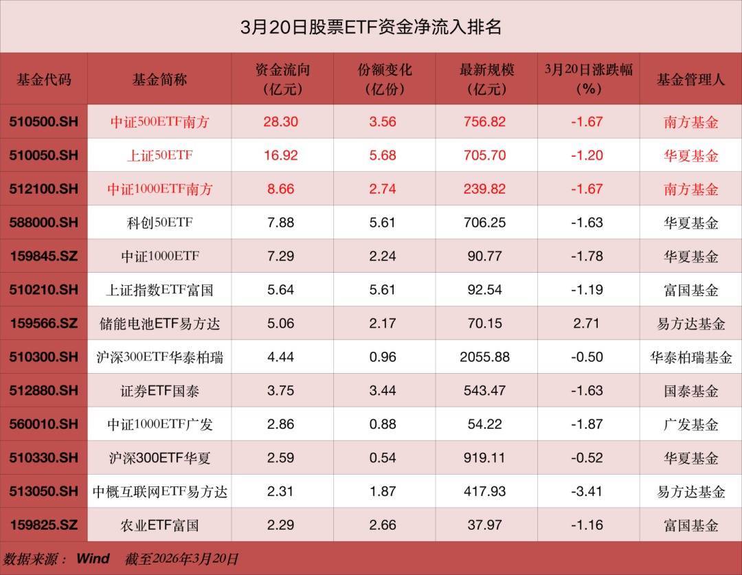 从大类型来看,上一交易日宽基ETF与债券ETF净流入居前,分别达41.8亿元与11.73亿元。具体到指数维度,3月20日中证500指数ETF资金净流入居前,达29.74亿元。中证1000指数、上证50指数、科创板50指数、沪深300指数等ETF资金净流入分别达19.8亿元、17.6亿元、11.3亿元、9.4亿元。