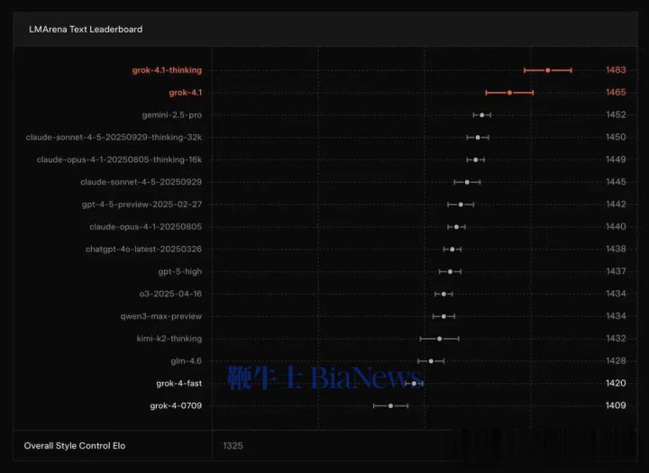 Grok4.1-thinking与Grok4.1分列第一、第二,领先最近的非xAI模型31分,属于断档式优势。