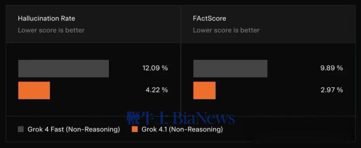 官方称Grok4.1是目前最不易产生幻觉的Grok模型,相比早期Grok4Fast幻觉率下降超过3倍。